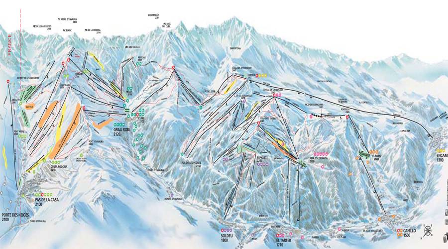 Ощутите то, что испытывают лучшие лыжники Европы! Совершите спуск по легендарной и недавно отреставрированной трассе Avet , где проходит Кубок Европы. Насладитесь панорамными видами на ратраке в Grandvalira-El Tarter и в Grandvalira-Porte des Neiges. Поужинайте на высоте 2000 метров над уровнем моря, под самым небом в ресторанах Grandvalira-Canillo, Grandvalira-El Tarter и Grandvalira-Grau Roig. Посетителыжную школу и сноупарк в Grandvalira-Grau Roig. Арендовать лыжное снаряжение можно в Grandvalira-Encamp и Grandvalira-Grau Roig. Если отдыхаете группой, то арендуйте лыжи и оборудование в Grandvalira-Grau Roig, а если Вам нужно взять напрокат экипировку для детей, то зайдите в Solanelles.