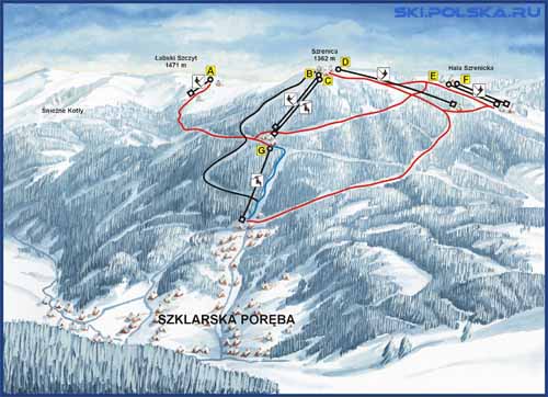 SkiArenaSzrenicaвключает в себя 5 лыжных спусков: Пухатек (1460 м, с искусственным освещением) и Быстра (2910 м ) – простые трассы. Снежинка ( 2080 м) и Лолобриджида (4444 м ) - сложные трассы и, наконец, Стена ( 2080 м) – самая сложная спусковая трасса.