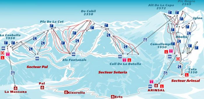 Регион Пал - Аринсаль расположен ближе всего к столице Андорры (10 км), в западной части страны, в области Ла Массана. Он состоит из горнолыжных баз Аринсаль и Пал, соединённых подъёмником — телекабиной Seturia.