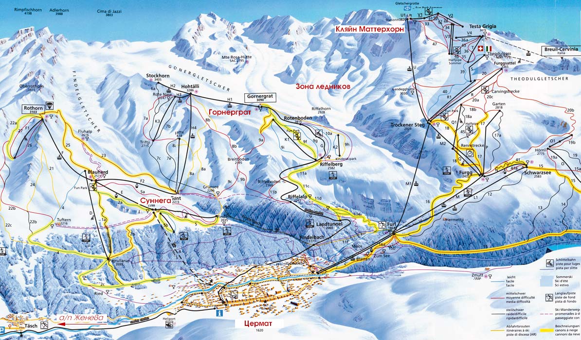 Горы в районе Церматт достаточно высоки и круты, это и определяет своеобразную структуру катания на горных лыжах. Здесь три больших сектора для катания на горных лыжах, практически не связанных между собой. Снизу ведут главные подъемники совершено различных типов. На северных склонах этой горы расположился один из наиболее сложных для катания районов Альп - Трифтьи. В третий, южный, сектор поднимает серия мощных маятниковых дорог через станцию Троккенер Штег до самой высокогорной станции Альп (3883м) - Кляйн Маттерхорн. Здесь пограничный пункт, и можно спуститься на горных лыжах на юг в Италию, попробовать себя на знаменитой скоростной трассе Червиния, где в 60-е устанавливались первые рекорды скорости, правда сейчас ее рельеф значительно изменился. Так как Церматт имеет меридиональное расположение, он защищен от проникновения ветров и снежный покров держится долго, горнолыжники и сноубордисты будут потрясены обилием снега, солнца и разнообразием трасс.