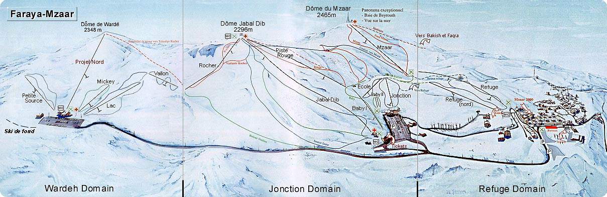 Фарайя-Мзаар– наиболее популярный и хорошо оборудованный горнолыжный курорт Ливана. Курорт включает в себя три района катания: Джонкшон, Варде и Рефьюдж. Основной – Джонкшон, именно в нем находится высшая точка района – гора Мзаар – 2465 м над уровнем моря. Трассы подходят и для горнолыжников и для сноубордистов; есть относительно ровные участки поверхности для катания на снегоходах и даже беговых лыжах.