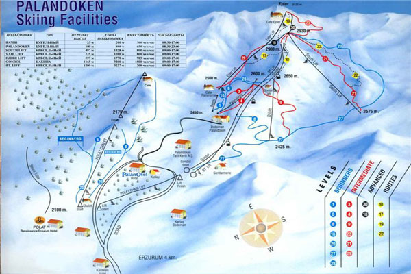 В Паландокене находится самая длинная и сложная трасса в Турции. В горах имеются пункты медицинской помощи. Возможно использование вертолётов вместо подъёмников. Для спортивных мероприятий по вашему запросу предоставляются гиды.Лыжный сезон в Паландокене длится 150 дней в году с Ноября по Май, а стопроцентный снег - с 10 декабря по 10 марта.При нормальных погодных условиях толщина снежного покрова достигает трех метров. Так как климат в этом регионе континентальный, то на протяжении всего зимнего сезона идёт мелкий снег.Зимой температура может опускаться до -9°С. Высота горы - 3.280 м над уровнем моря. Зона катания лежит между 2.150 м и 3.200 м.Курорт приобрел популярность благодаря разнообразию трасс, позволяющему лыжнику любого уровня найти спуск по своему вкусу. Здесь можно обучить ребенка или новичка азам горнолыжного спорта; покататься всей семьей; отвести душу на черных трассах или же прокатиться по целине.